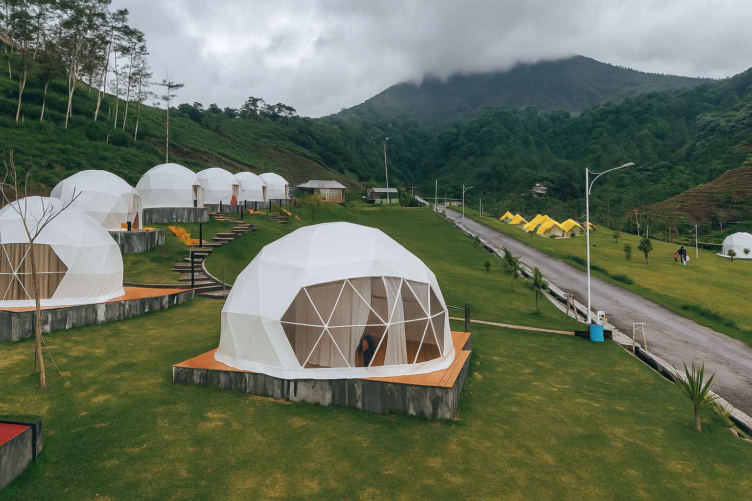 Di sisi lain, ada lokasi glamping yang menghadirkan pemandangan gunung dari segala arah. Tenda berbentuk kubah modern berdiri di lahan luas, menawarkan sunrise hingga sunset tanpa harus keluar kamar. Suasana ini menjadi magnet bagi pemburu foto.