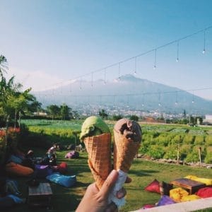 Cafe cantik ini benar-benar memikat hati. Kamu bisa langsung melihat hamparan kebun seledri dengan background gunung Banyak. Ada tiga pilihan tempat bisa di indoor, teras atau di outdoor. Ada banyak pilihan menu, mulai dari tradisional hingga western food.