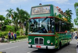 Modelnya adalah bus berwarna hijau dilengkapi tulisan Malang City Tour di sisi kiri dan kanannya dengan desain jadul. Terdiri dari dua lantai dan lantai atas dalam bentuk bak terbuka. Kapasitasnya hanya 40 orang sekali jalan.