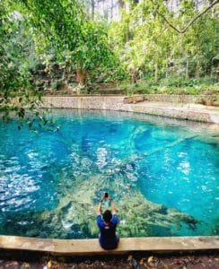 Terdapat tonggak kayu raksasa yang ada di dalam air. Konon, umurnya sudah ratusan tahun. Airnyayang dingin dan dalam akan membuat snorkelingmu tambah berkesan. Tiket masuknya gratis, kamu cukup membayar parkir di sekitar Rp 5.000. Baik mobil atau motor bisa langsung menuju lokasi.