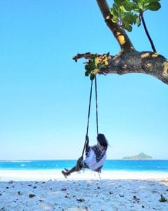 Bentangan pasir putih yang luas, beberapa karang dan ombak yang lumayan besar. Ombak pantai ini relatif besar. Pantai ini memiliki rumah pohon dan ayunan yang instagenic lo.