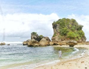 Ada yang menyebutnya pantai perawan. Pantai ini unik karena bibir pantainya berbentuk cekungan seolah-olah seperti teluk. Pasir putih cenderung coklat yang eksotis pun juara disini.